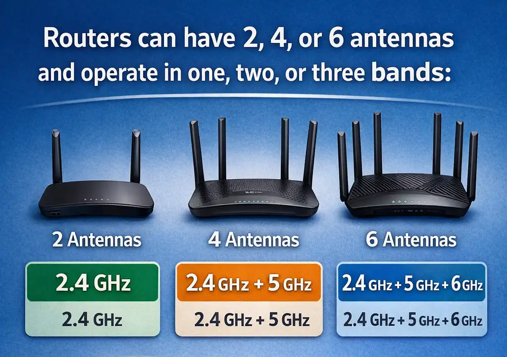 Idag kan routrar ha två, fyra eller sex antenner och fungera i ett band (2,4 GHz), två band (2,4 GHz och 5 GHz) eller tre band (2,4 GHz, 5 GHz och 6 GHz). Därför är det bättre att fokusera på detaljerade tekniska specifikationer snarare än på iögonfallande marknadsföringstermer.