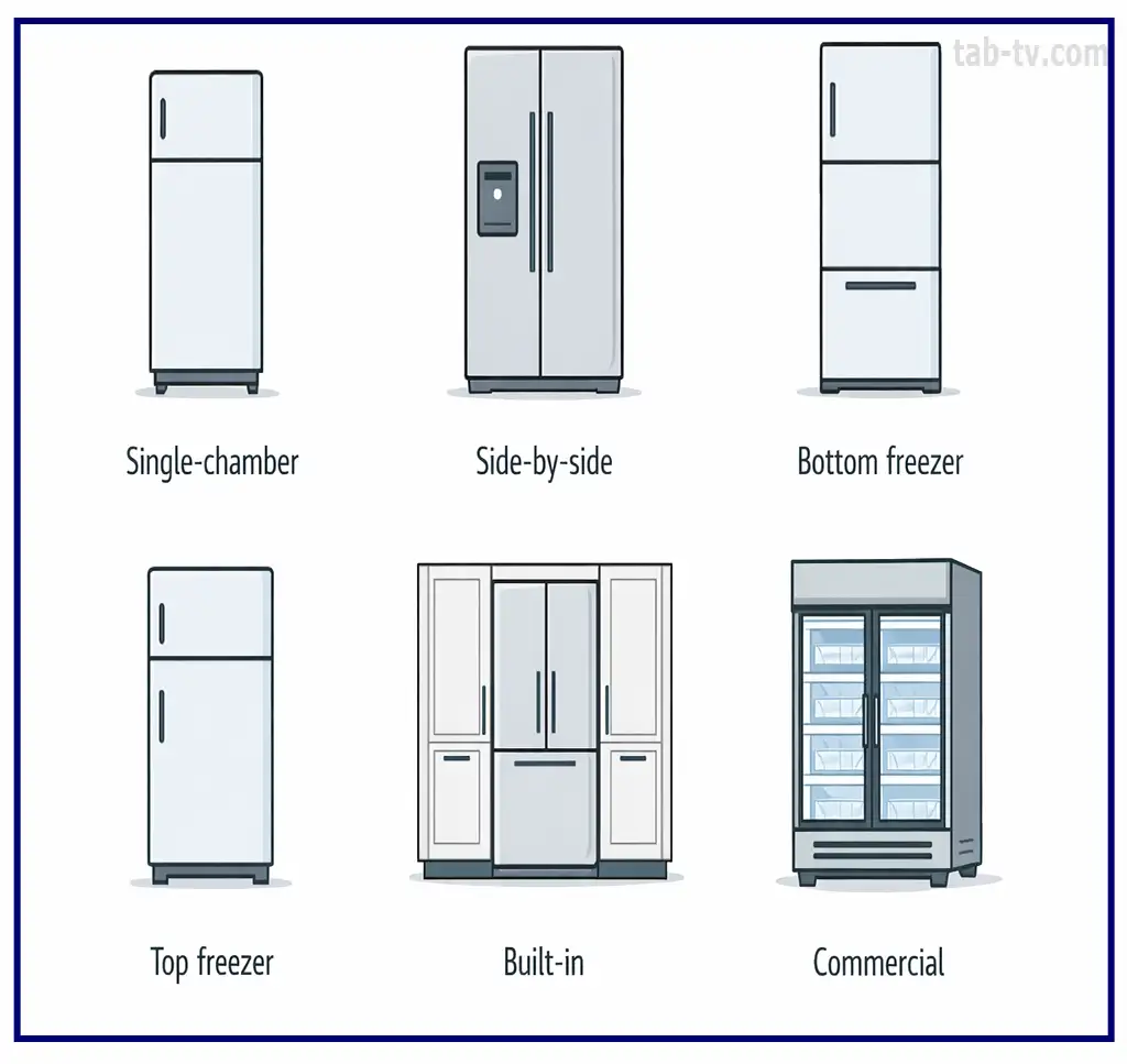 Enkammarmodeller är kompakta och har ett litet frysfack. Side-by-side-modeller har kyl- och frysdelen placerade vertikalt, erbjuder stor kapacitet och inkluderar vatten- och isdispenser. En mer praktisk lösning är ett kylskåp med frysen längst ner och huvudfacket i ögonhöjd. Modeller med frysen upptill är en klassisk lösning, men denna design anses nu vara föråldrad, även om sådana kylskåp fortfarande tillverkas. Inbyggda kylskåp installeras i köksskåp; de är ganska vanliga, och vissa tillverkare, som Samsung, har hela produktlinjer av sådana produkter.